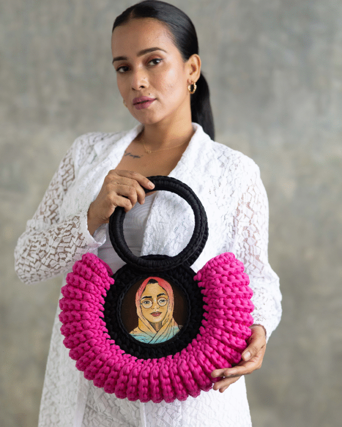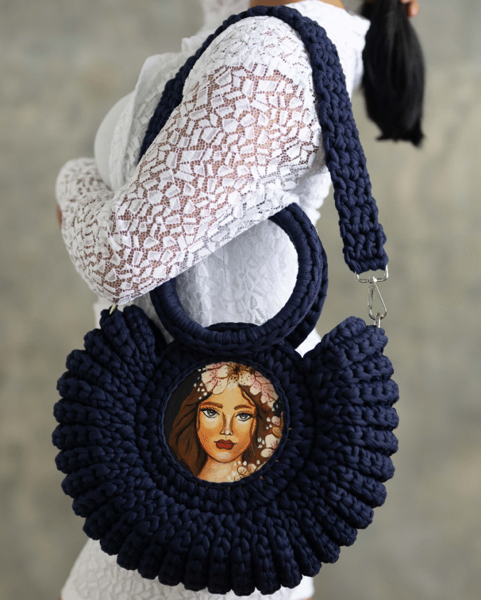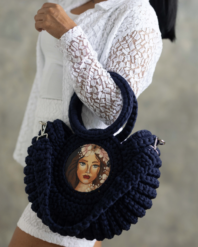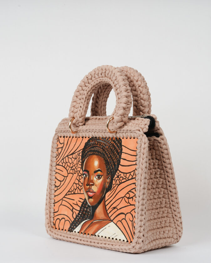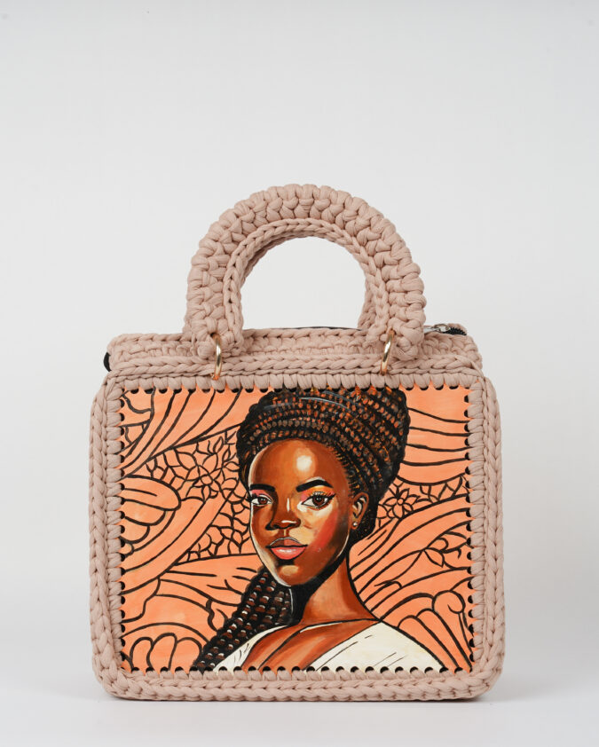 Hand-crocheted with love and adorned with a stunning hand-painted portrait celebrating beauty, strength, and heritage, this one-of-a-kind tote is more than a bag.