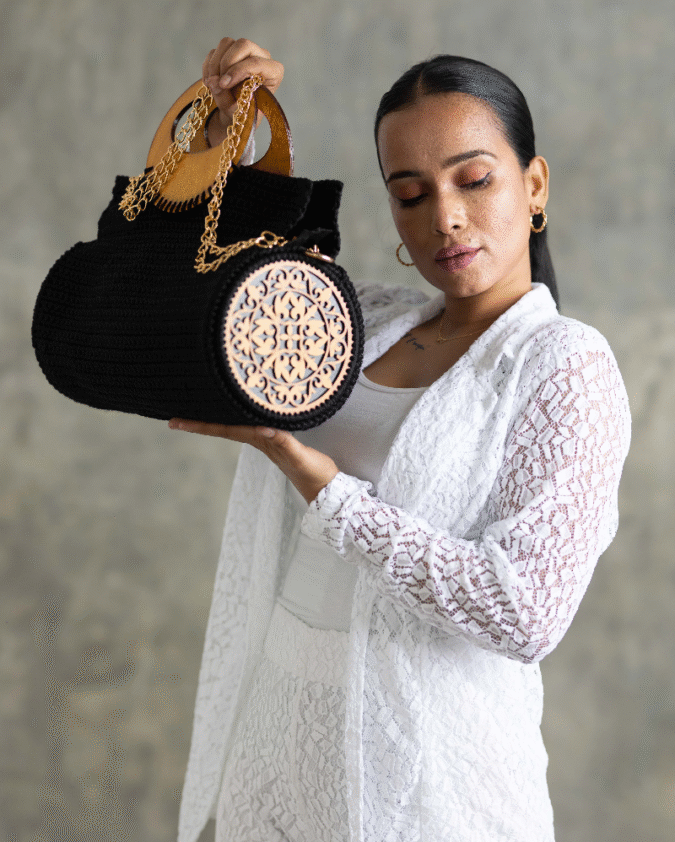 Our handmade crochet bags make a thoughtful gift for yourself or someone special Handmade products should be handled with love and care. To preserve the beauty and longevity of your crochet bag, please read the following care guidelines carefully, along with the product descriptionMini Crochet Bag with Wooden Base- Black