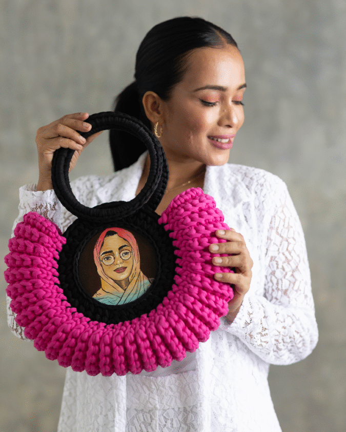 Turn heads with the vibrant charm of the Bold Muse Crochet Bag, a truly one-of-a-kind accessory that blends craftsmanship with cultural artistry. Hand-crocheted in striking pink and black yarn, this circular bag features a stunning wooden base with an original hand-painted portrait—adding soul and individuality to every piece.