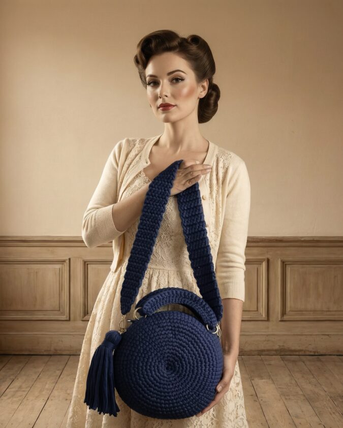 Chic, bold, and beautifully handmade — this round crochet bag is a true statement piece for the modern wardrobe. Expertly crafted from thick, durable yarn in a rich navy blue, its circular silhouette adds a playful yet sophisticated touch to any outfit.